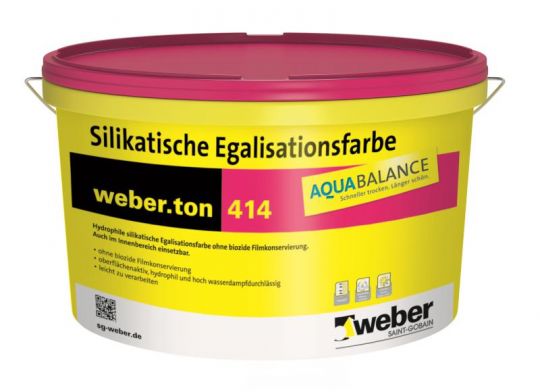 Hydrophile silikatische Egalisationsfarbe ohne biozide Filmkonservierung. Das Produkt ist eine hochwasserabweisende Silikonharzfassadenfarbe mit sehr hohem Silikonharzbindemittelanteil auf der Basis modifizierter reiner Silikonharzemulsion für außen. Weberton 414 AquaBalance ist eine silikatische Egalisierungsfarbe mit dauerhaftem Schutz gegen Algen und Pilzeweberton 414 AquaBalance eignet sich besonders zum Überstreichen von eingefärbten und ungleichmäßig ausgetrockneten farbigen mineralischen Putzen und Silikatputzen.
