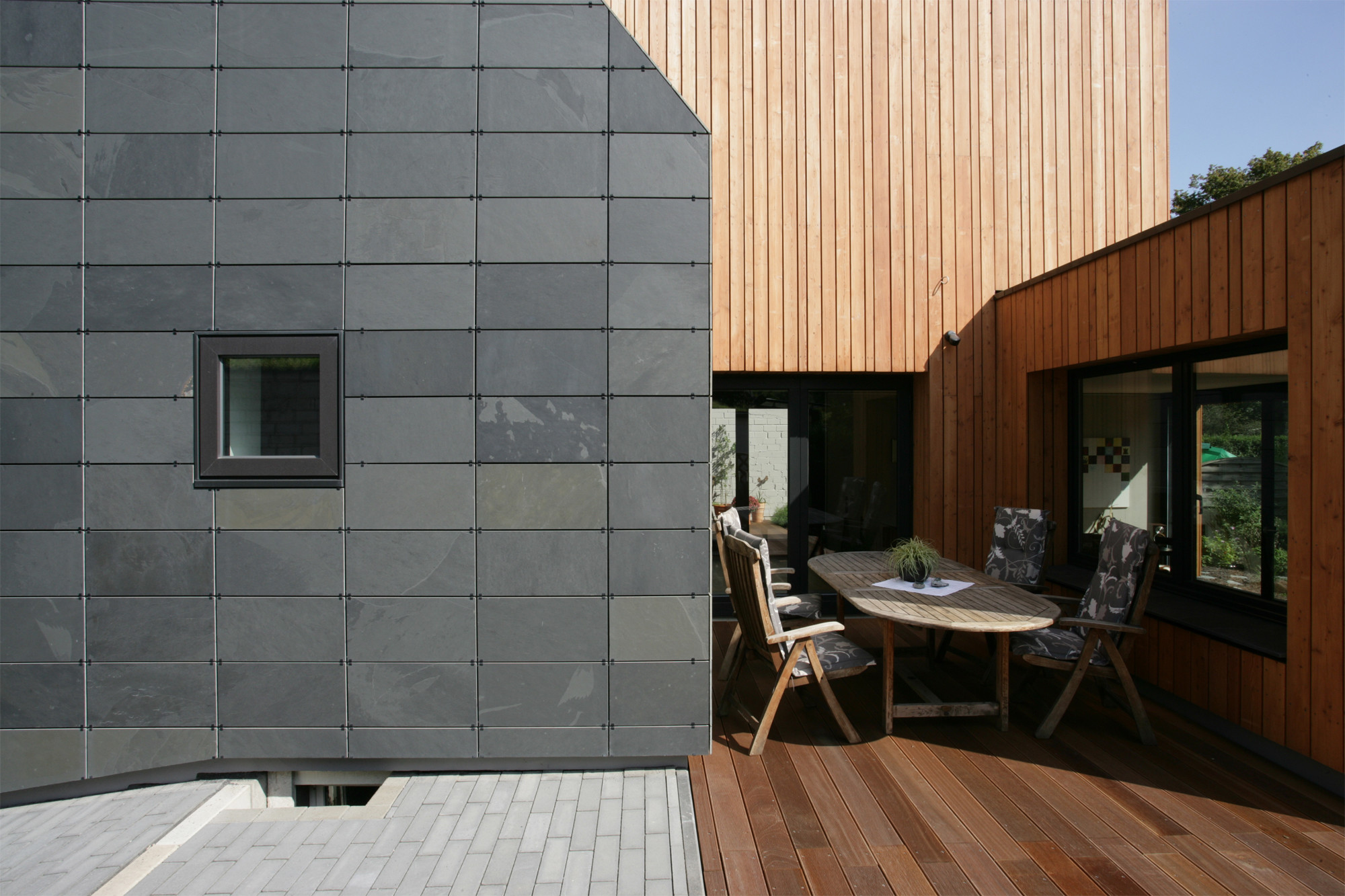 Schieferplatten verlegen fassade. Fassadenplatten werden meist auf einen Rahmen montiert. Von fern wirken sie wie eine flächig anschmiegsame Haut von nah betrachtet entsteht ein plastisch strukturiertes Oberflächenbild. Weitere Informationen unter httpwwwfassaden-dachde Die Zierer Schieferplatten aus glasfaserverstärktem Kunststoff gefallen durch ihr klassisches Aussehe.